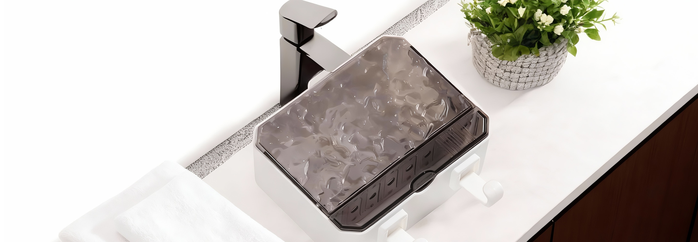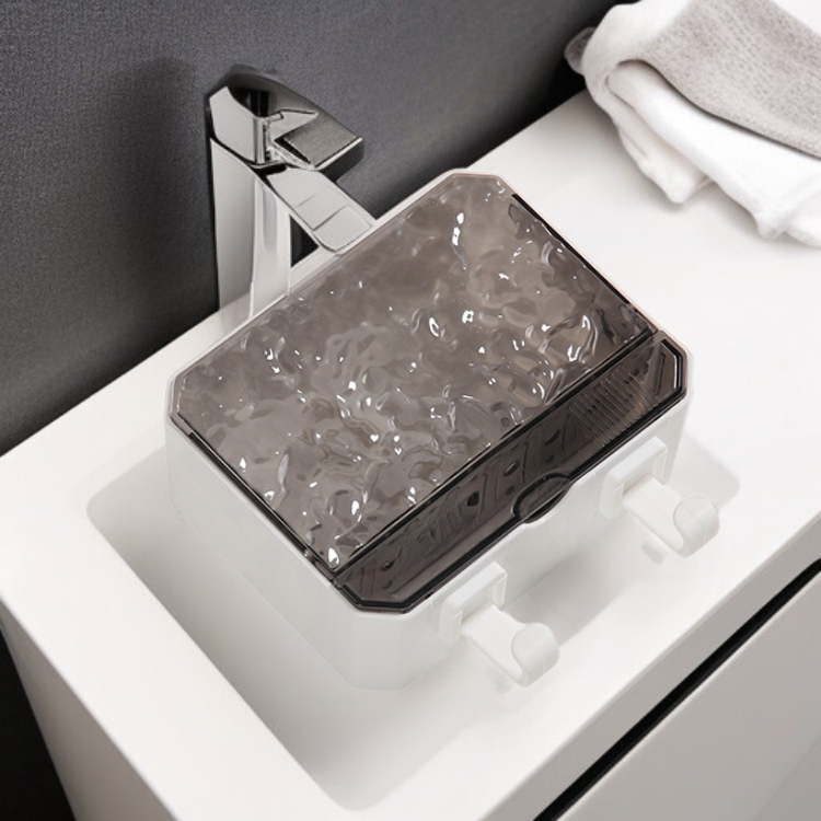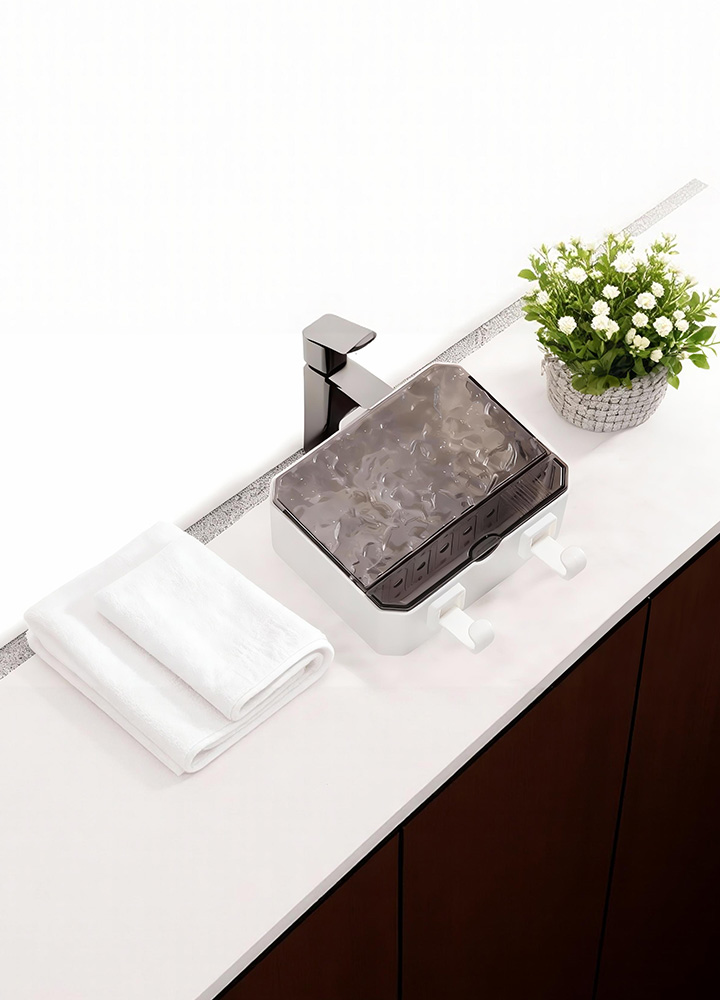 Nowoczesna mydelniczka ścienna z falistą pokrywą zapewnia higieniczne przechowywanie mydła, chroniąc je przed wilgocią i zabrudzeniami.